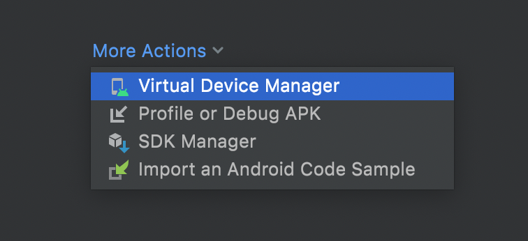 ようこそ画面が表示されるので、下の方にある「More Actions」から「Virtual Device Manager」をクリックします。