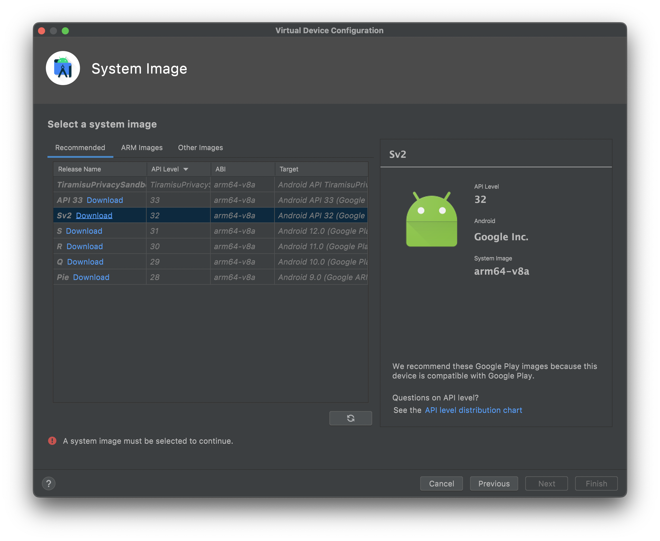 次にイメージの選択をします。「S」を選びます。これはAndroid 12を指します。「Sv2」はタブレット向けのAndroid 12Lなので注意してください。アーキテクチャも「x86_64」だと激重になるので、「arm64」のものを選んでください。