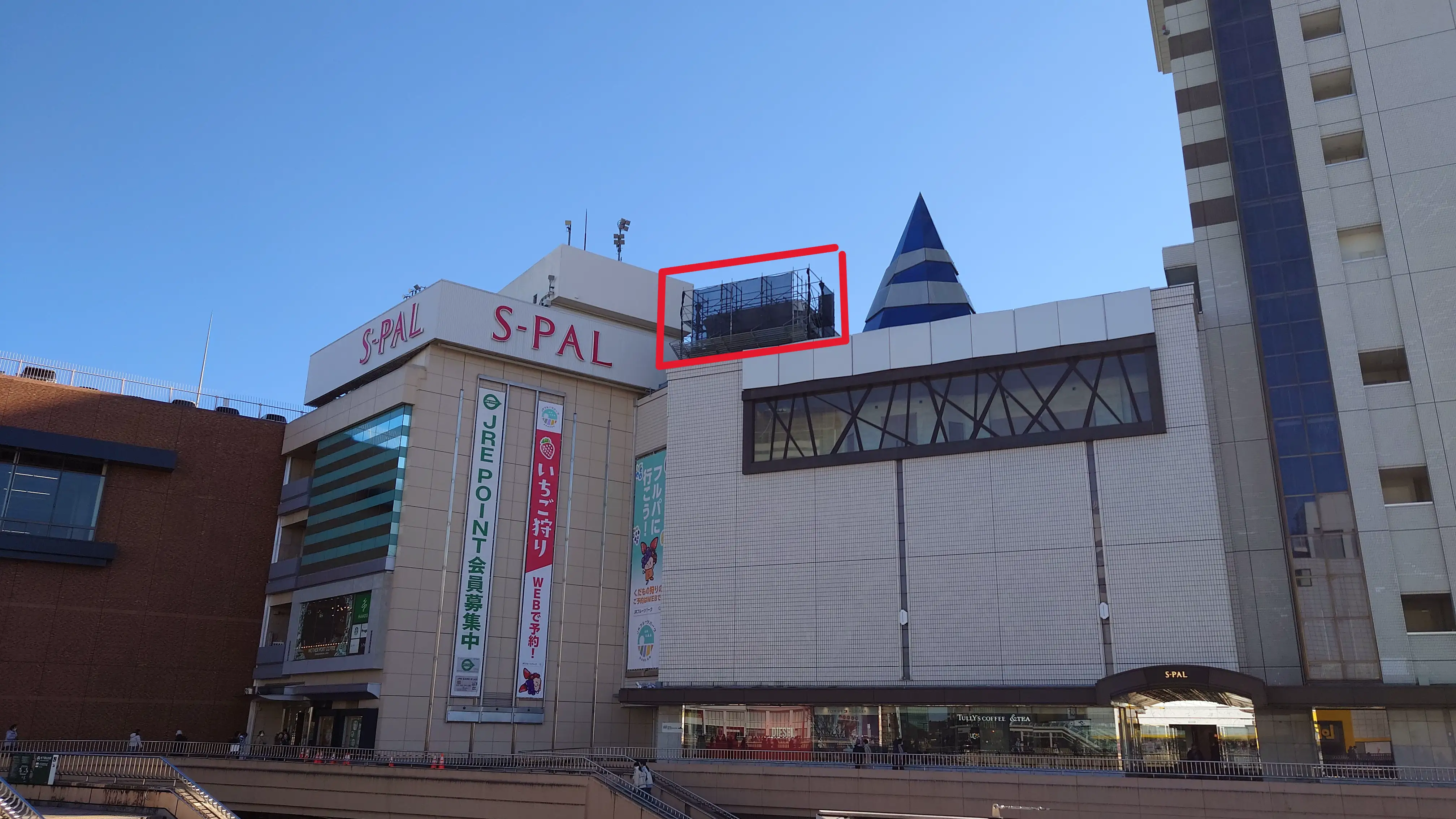 S-PAL屋上にドコモが基地局を新設。指向性強めの3セクターでペデストリアンデッキをカバーします。